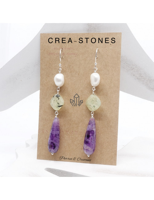 Perle biwa, prehnite et améthyste, Boucles d'oreilles