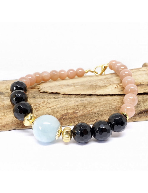 Pierre de soleil, obsidienne noire facettée et aigue-marine, Bracelet creation