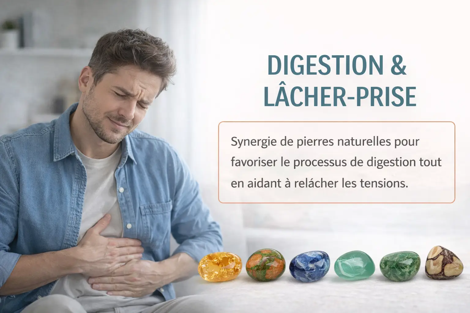 Synergie de pierres naturelles pour accompagner la digestion émotionnelle, favoriser le lâcher-prise et retrouver un meilleur confort intérieur. Relâcher les tensions, apaiser le ventre et retrouver légèreté et bien-être intérieur.