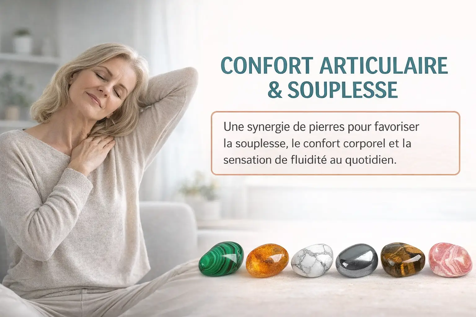 Synergie de pierres naturelles pour accompagner le corps vers plus de mobilité, de confort et de légèreté.
