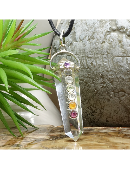 Les 7 chakras sont présents sur ce joli pendentif avec les pierres grenat, cornaline, citrine, péridot, pierre de lune, labradorite et améthyste.